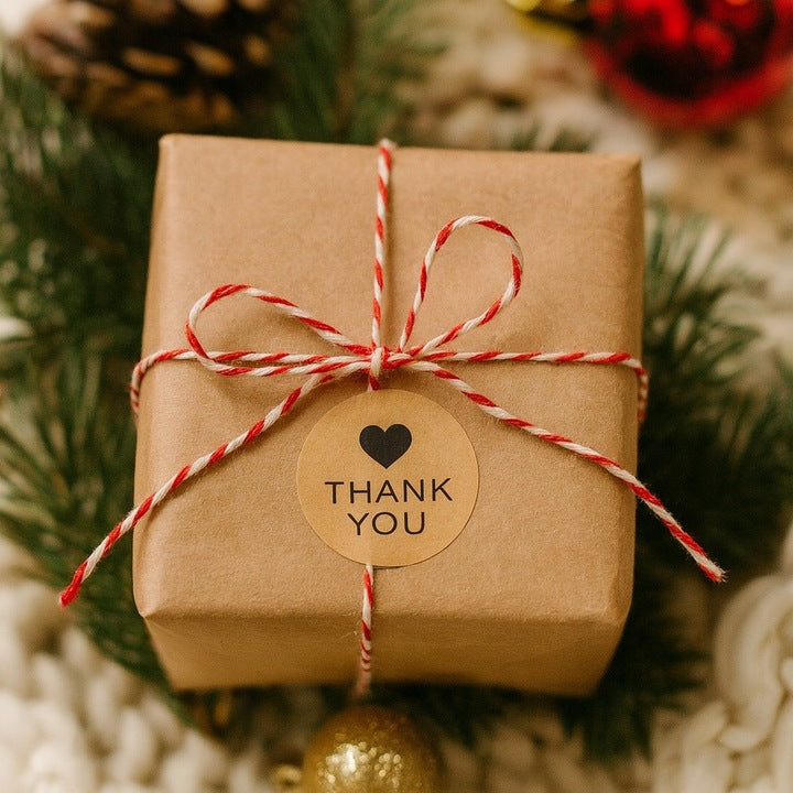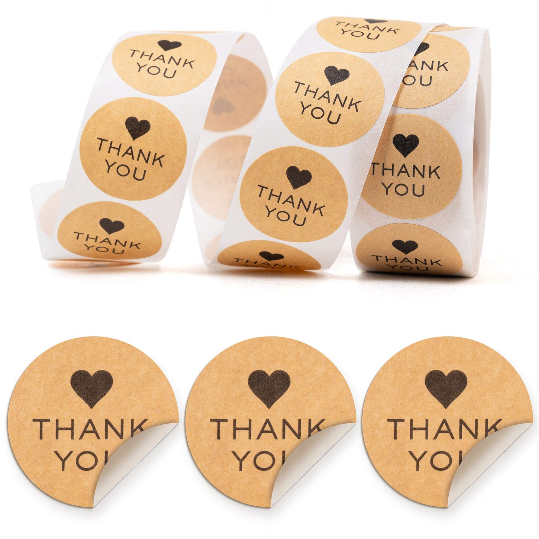 Postaw na naklejki Thank You z serduszkiem. Okrągłe etykiety samoprzylepne 2,5 cm na rolce 500 szt. w stylu kraft.  Nadaj swoim upominkom, przesyłkom i produktom elegancki, akcent w kilka sekund!