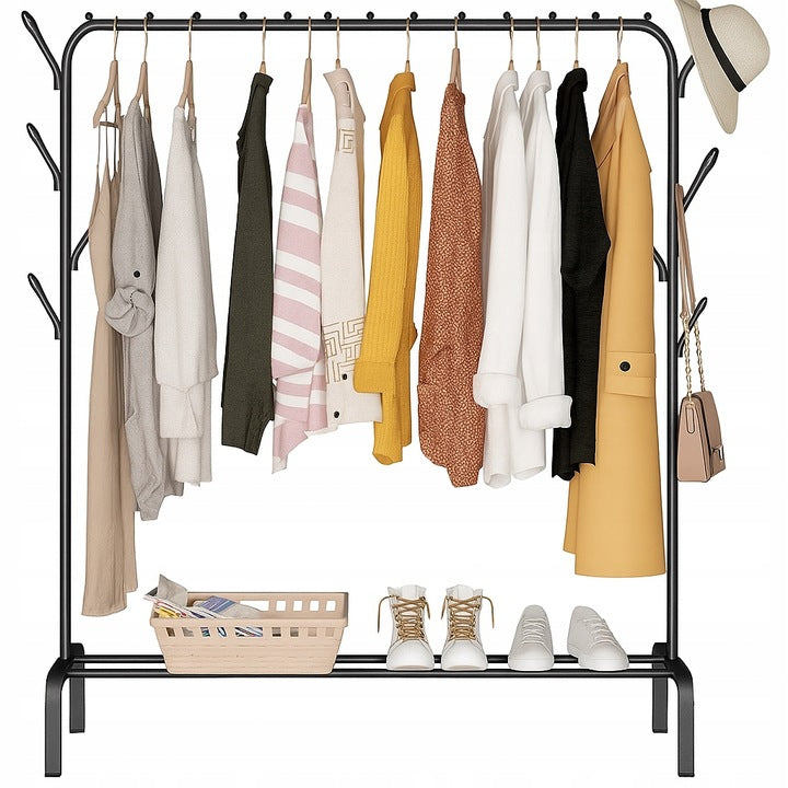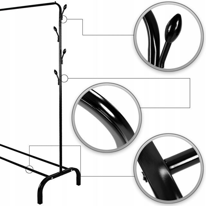 • Minimalistyczny wieszak garderobiany: Elegancki stojak podłogowy w czarnym, matowym wykończeniu