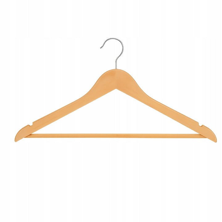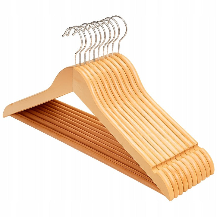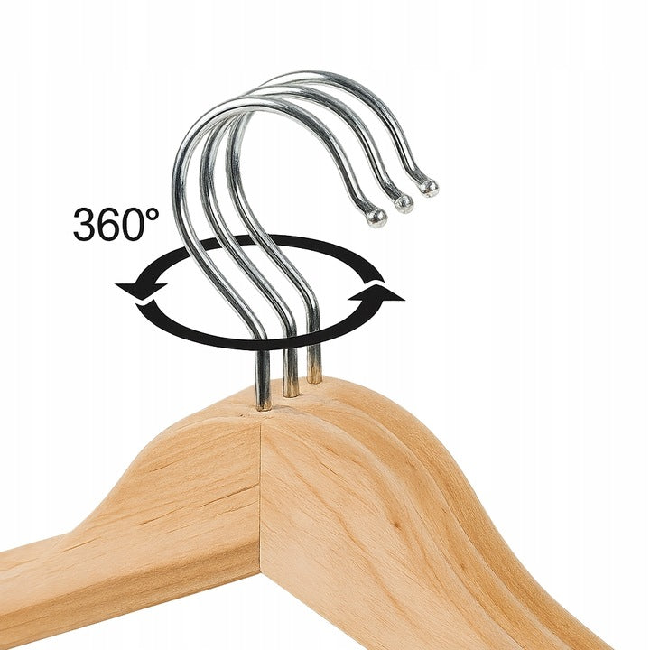 Zamów zestaw 10 drewnianych wieszaków 43×21 cm z obrotowym hakiem 360°, poprzeczką na spodnie i wcięciami na ramiączka. Idealne wieszaki do szafy, garderoby i butiku. Trwałe, eleganckie i antypoślizgowe, utrzymają płaszcze, marynarki i koszule bez zagnieceń.