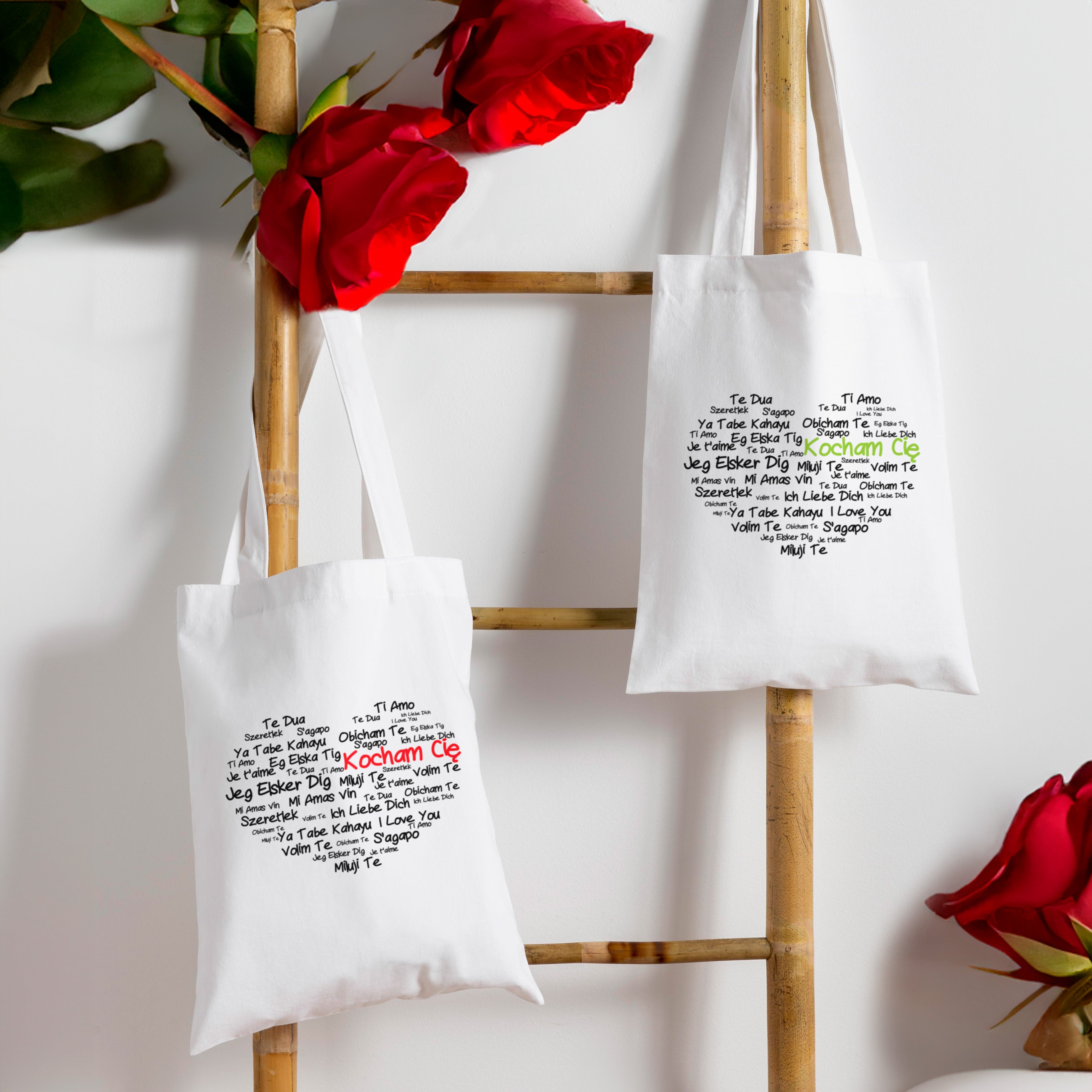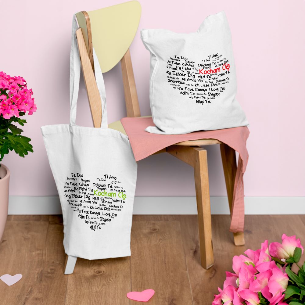 Două genți din bumbac cu imprimare. Accesoriu modă ideal pentru cupluri și cadou original de Ziua Îndrăgostiților.