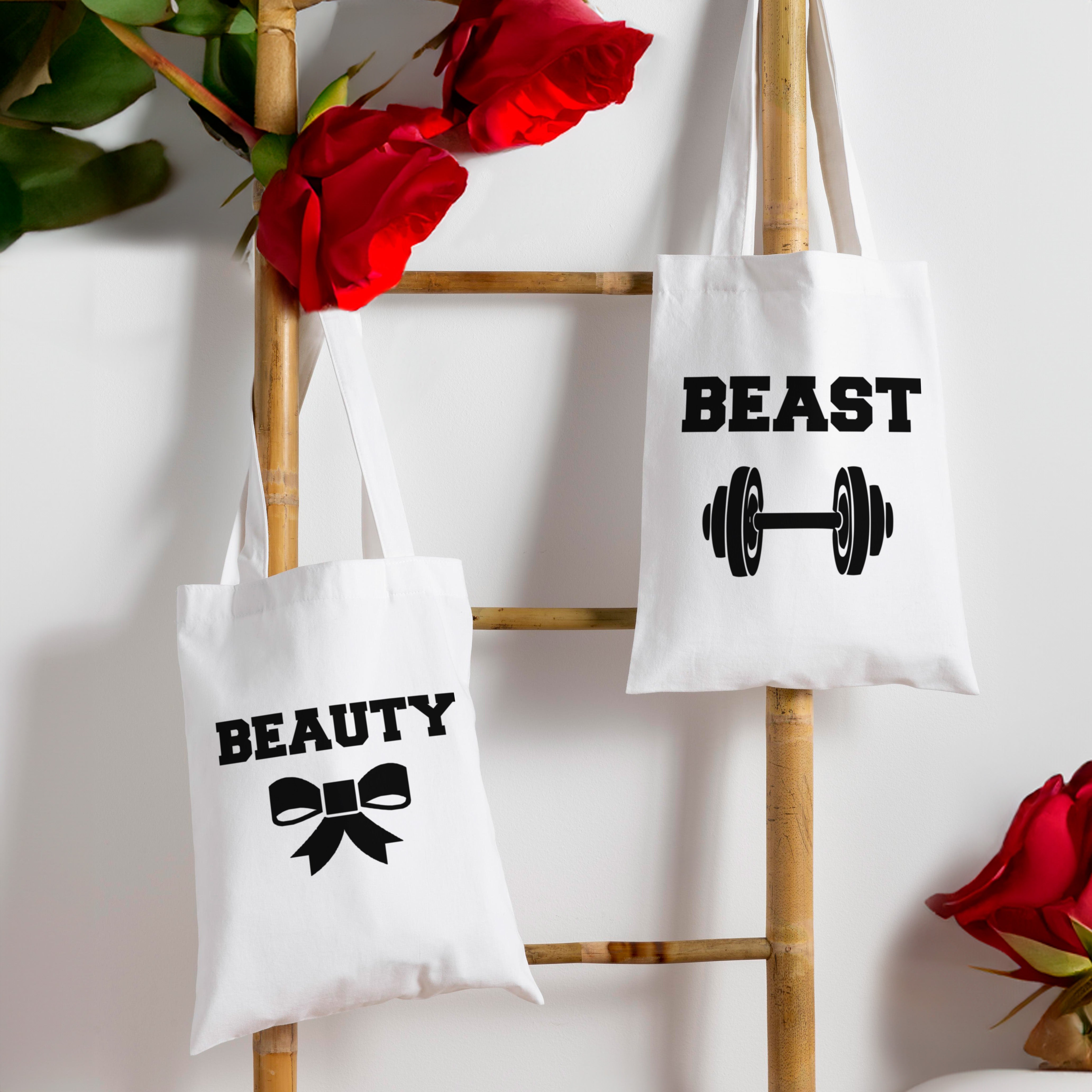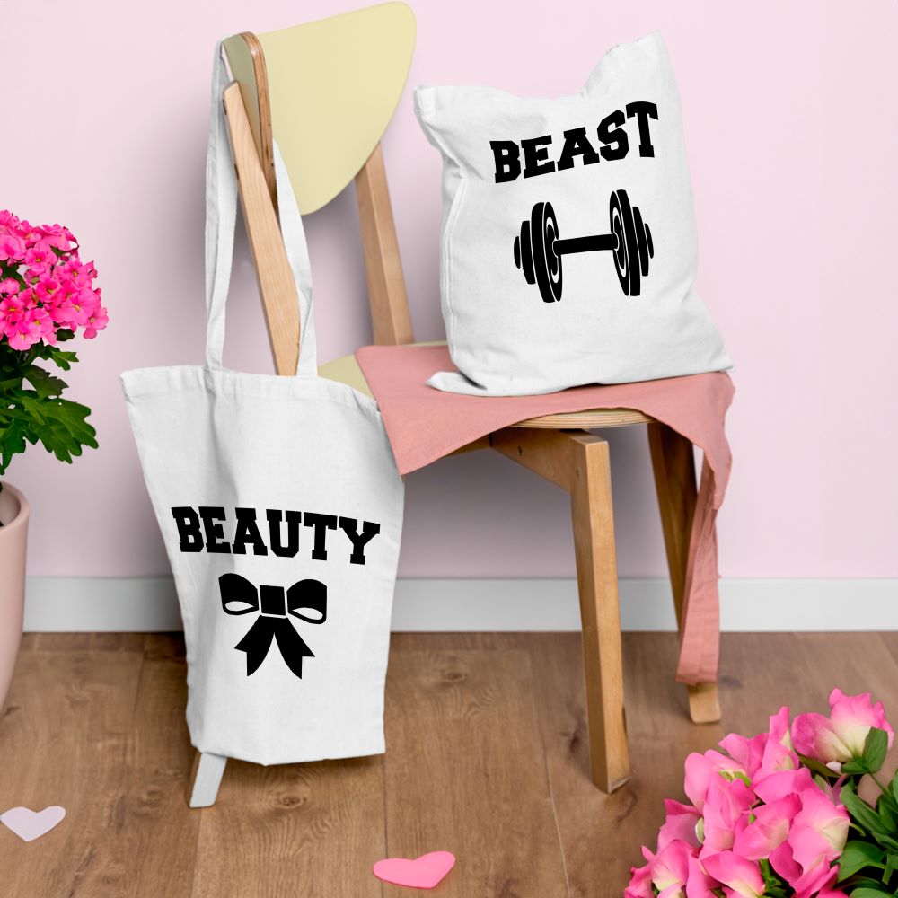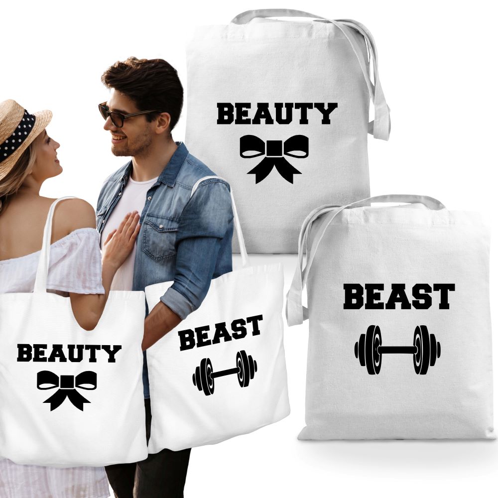Două genți din bumbac cu imprimare. Accesoriu modă ideal pentru cupluri și cadou original de Ziua Îndrăgostiților.