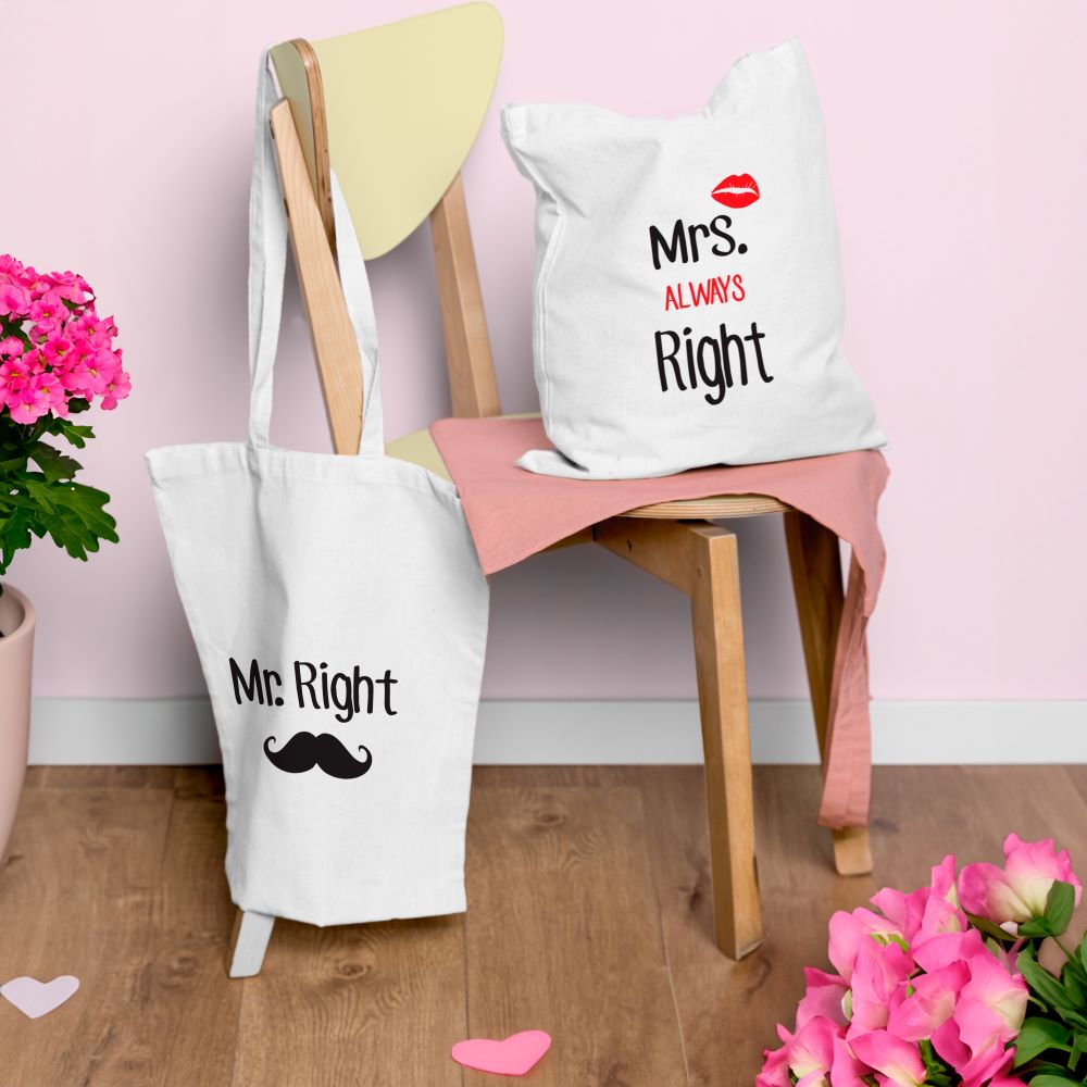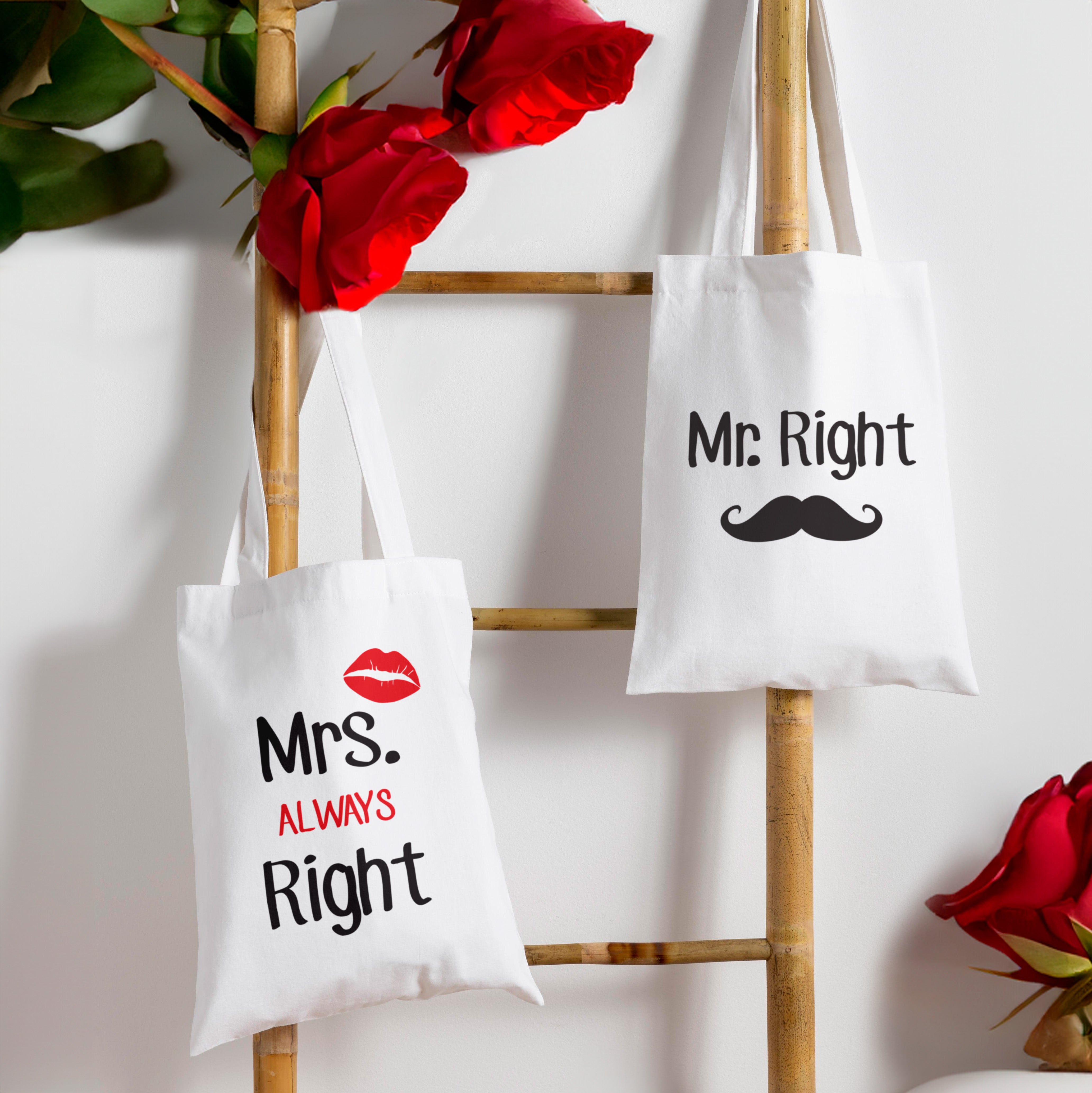 Două genți din bumbac cu imprimare. Accesoriu modă ideal pentru cupluri și cadou original de Ziua Îndrăgostiților.