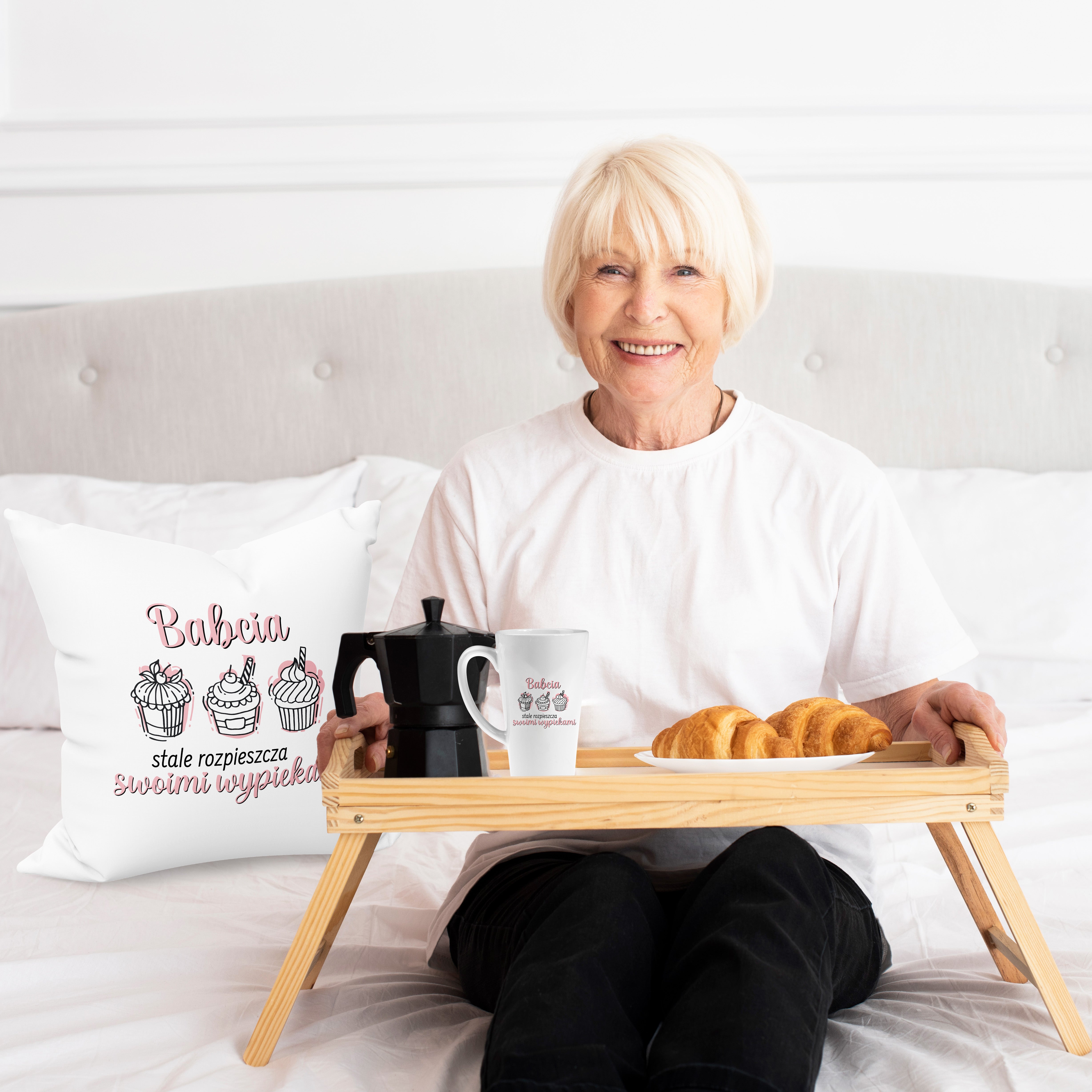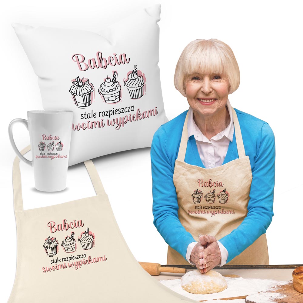 Zestaw Fartuch,Kubek,Poduszka Babcia Rozpieszcza Wypiekami Prezent na Dzień Babci