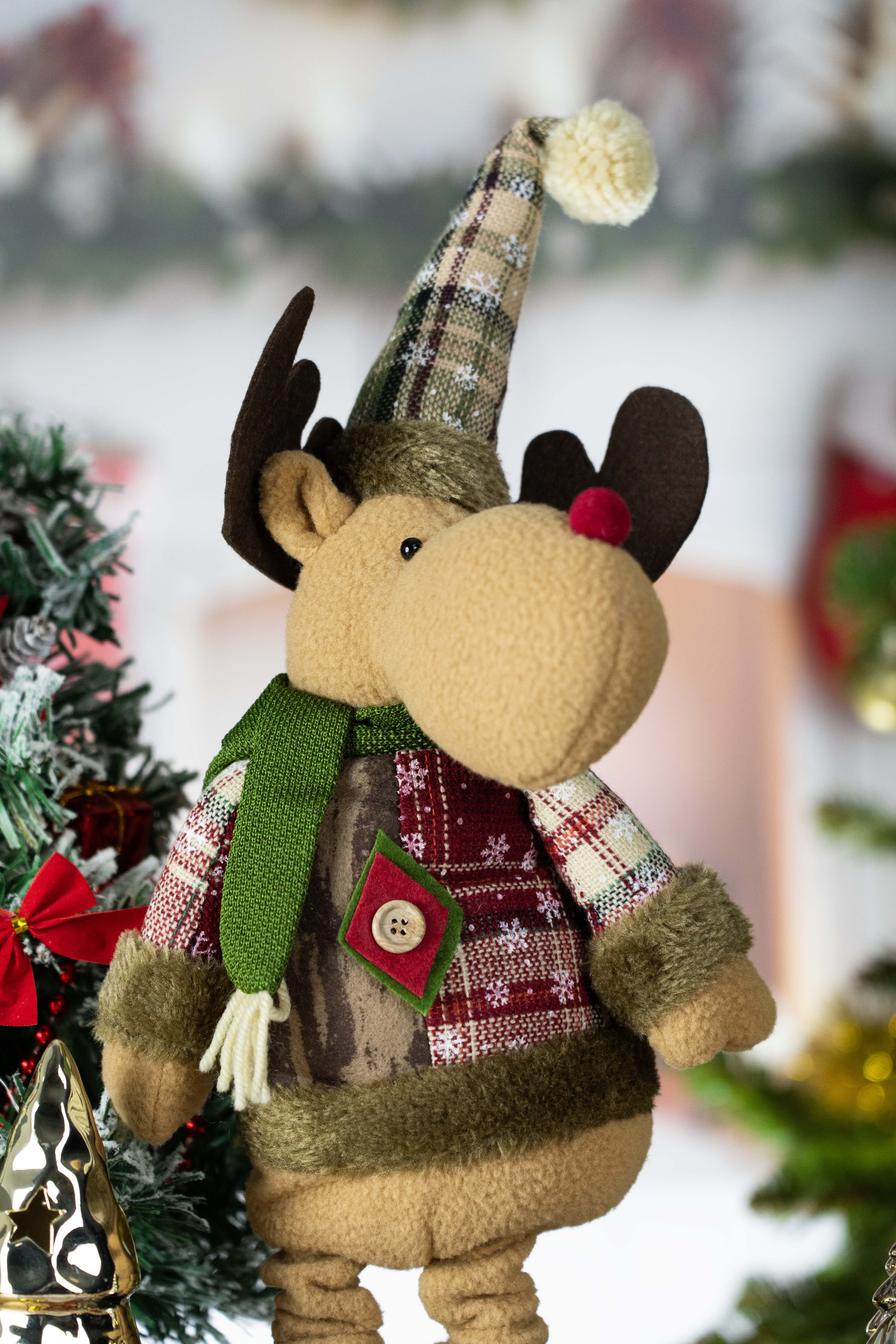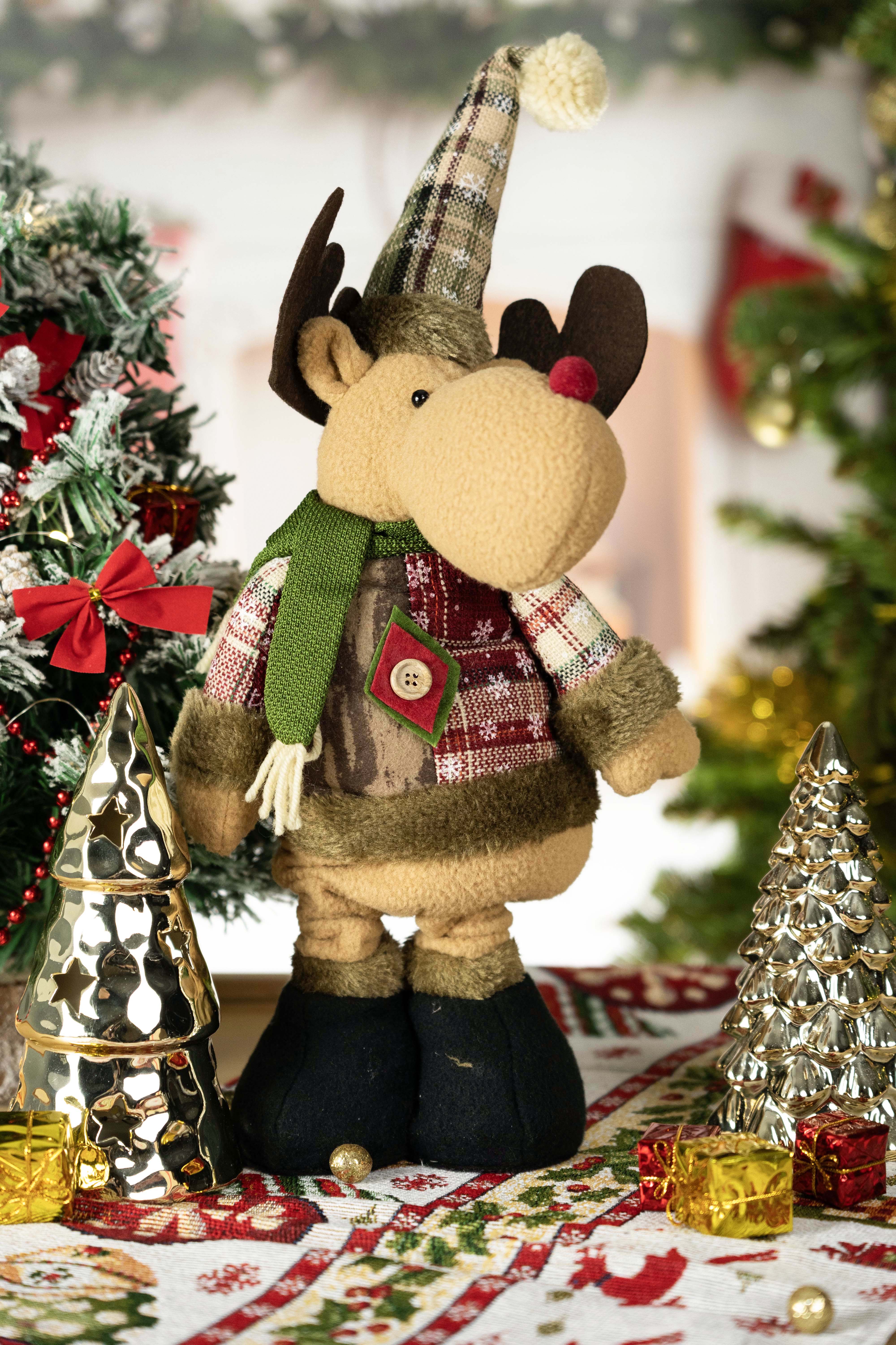Această figurină drăguță a Reniferului de Crăciun este o decorațiune perfectă care va adăuga un spirit magic de Crăciun în orice interior. Îmbrăcat într-un costum elegant cu carouri și finisaje din blăniță, cu o pălărie confortabilă și un fular, Reniferul capătă un farmec deosebit de iarnă. Datorită detaliilor atent realizate, cum ar fi nasturii și pompoanele, va deveni un frumos adăugir pentru decorul tău de Crăciun.