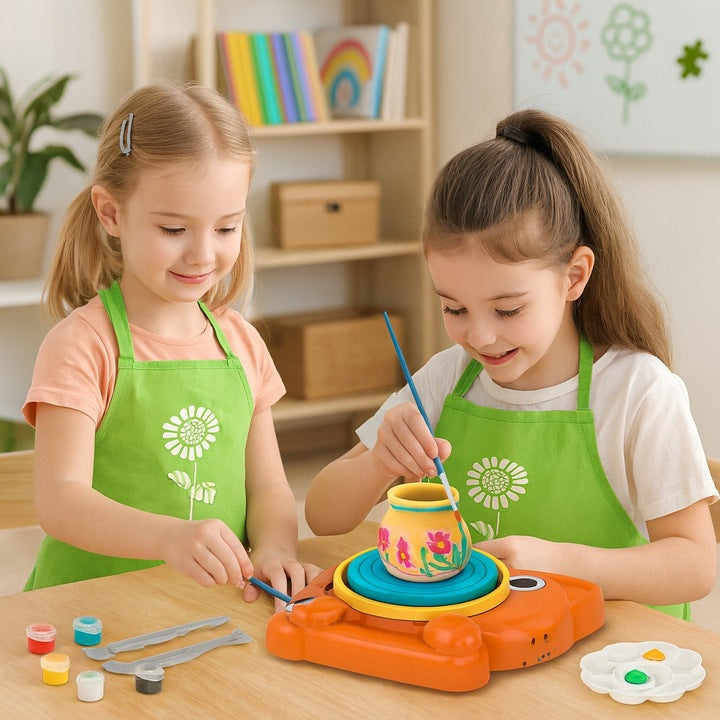 • Domowa pracownia garncarska dla dzieci: Zestaw pozwala dziecku samodzielnie formować z gliny miseczki, kubeczki i proste figurki na działającym kole garncarskim