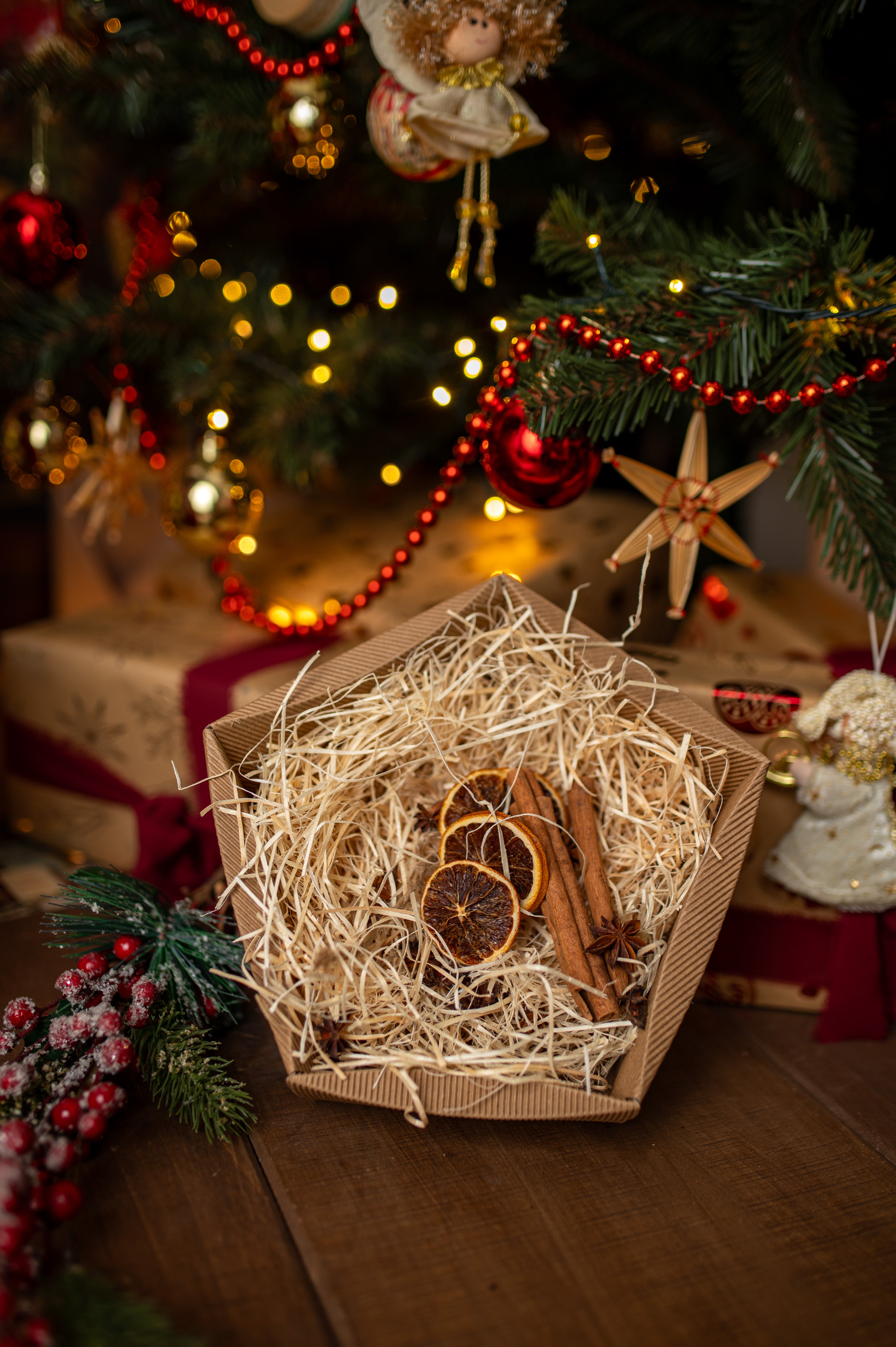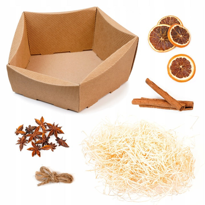 • Zestaw DIY: Zawiera wszystkie elementy potrzebne do stworzenia wyjątkowej kompozycji:  ekologiczne pudełko, naturalne sianko oraz pachnący susz świąteczny z pomarańczy, cynamonu i anyżu