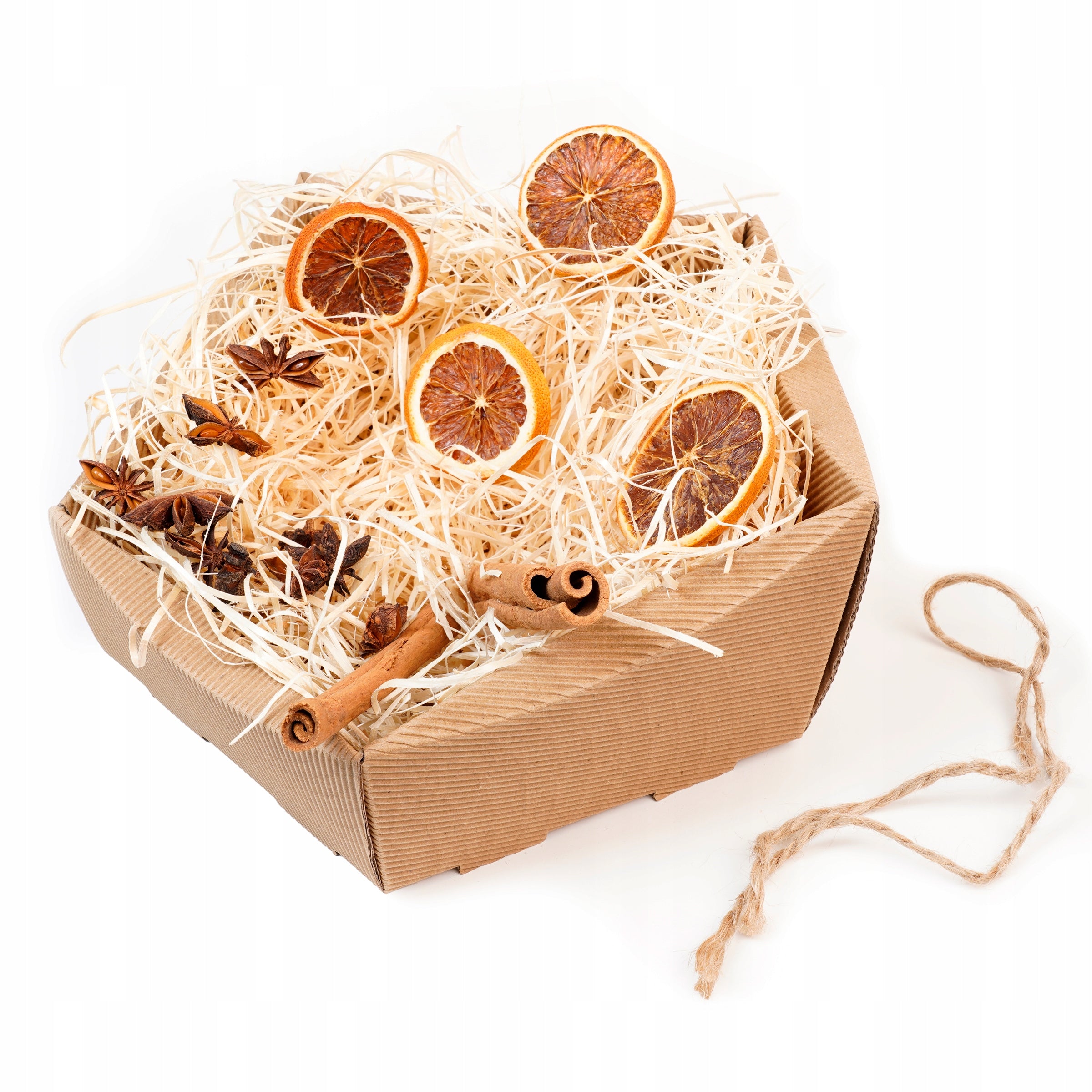 • Zawartość zestawu: plastry pomarańczy (ok. 15 g), laseczki cynamonu (ok. 20 g), gwiazdki anyżu (ok. 15 g), sianko dekoracyjne, pudełko