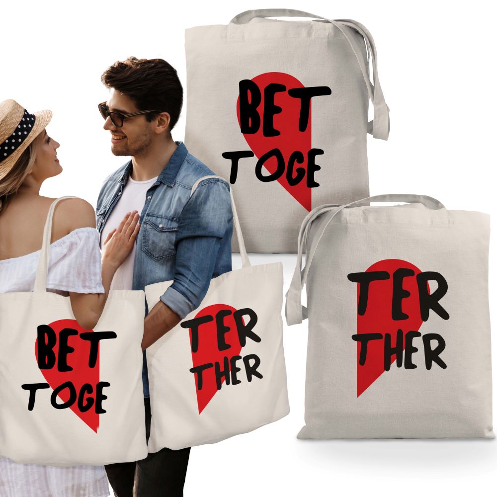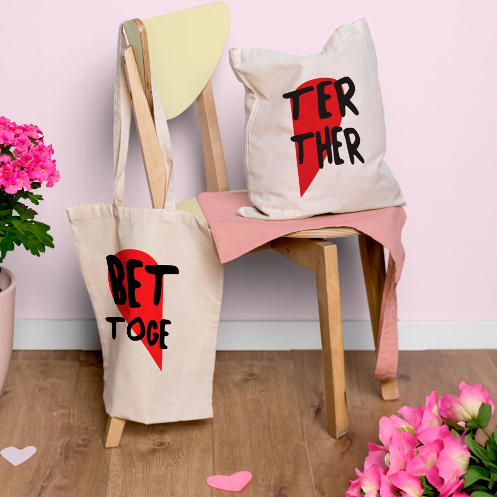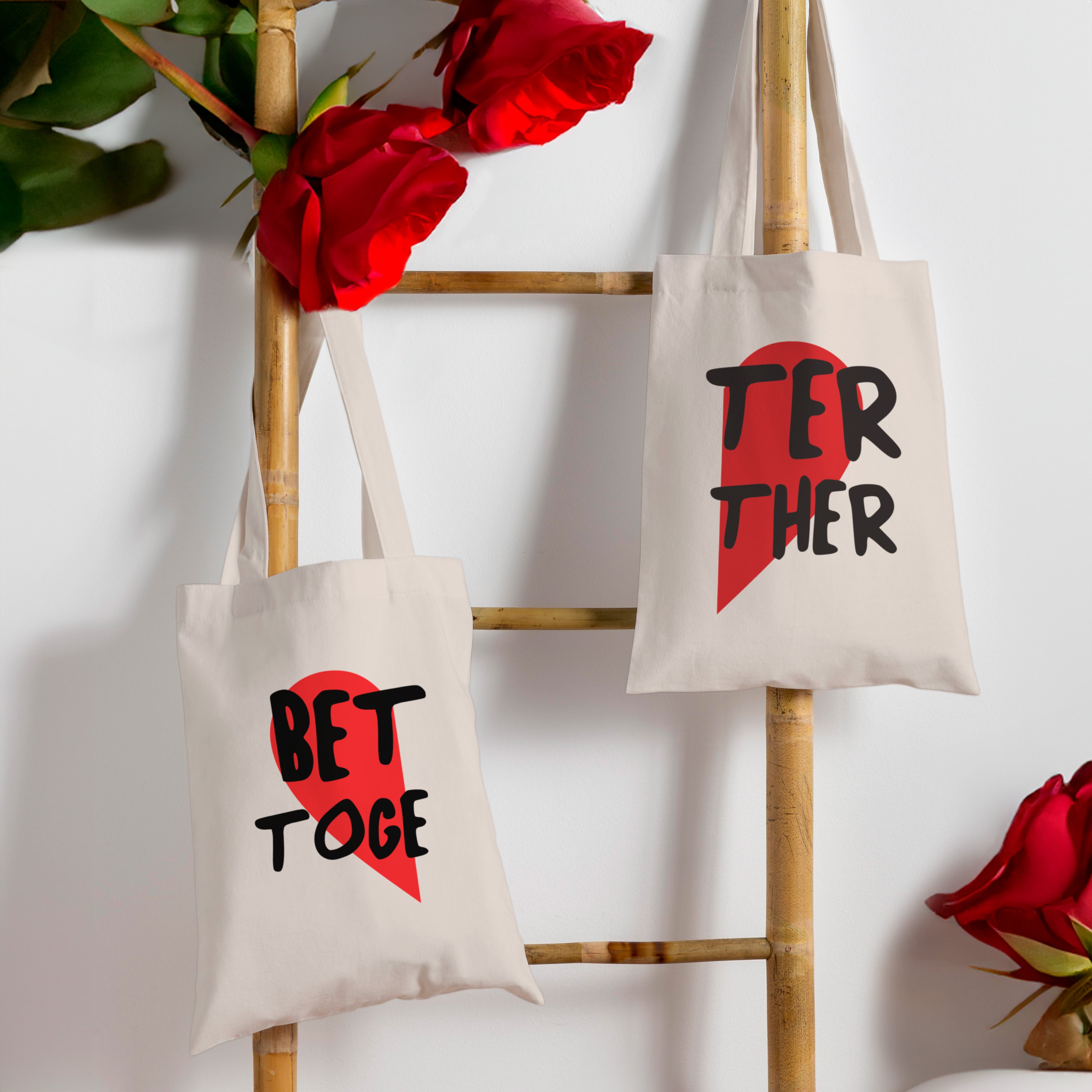 Două genți din bumbac cu imprimare. Accesoriu modă ideal pentru cupluri și cadou original de Ziua Îndrăgostiților.
