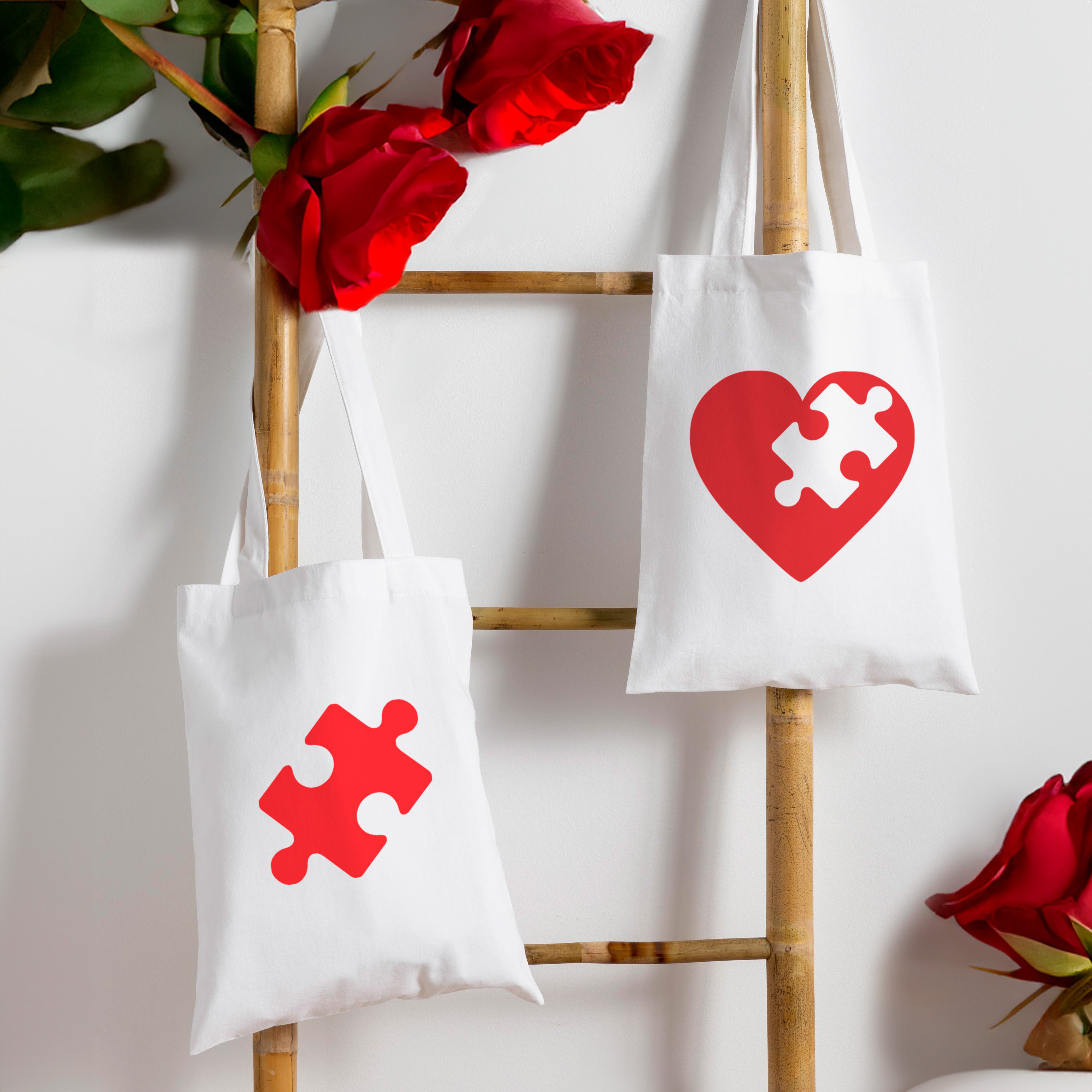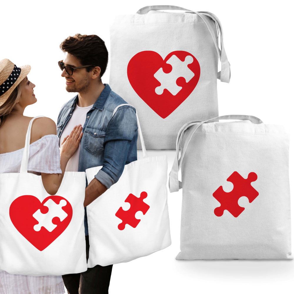 Două genți din bumbac cu imprimare. Accesoriu modă ideal pentru cupluri și cadou original de Ziua Îndrăgostiților.