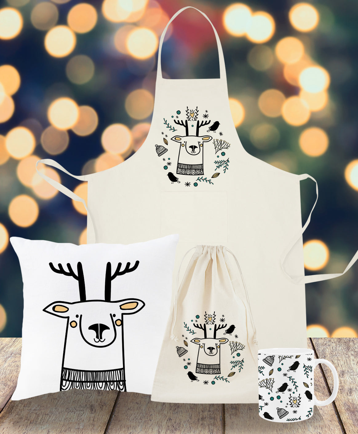 Zestaw świąteczny WOREK PODUSZKA FARTUCH KUBEK renifer