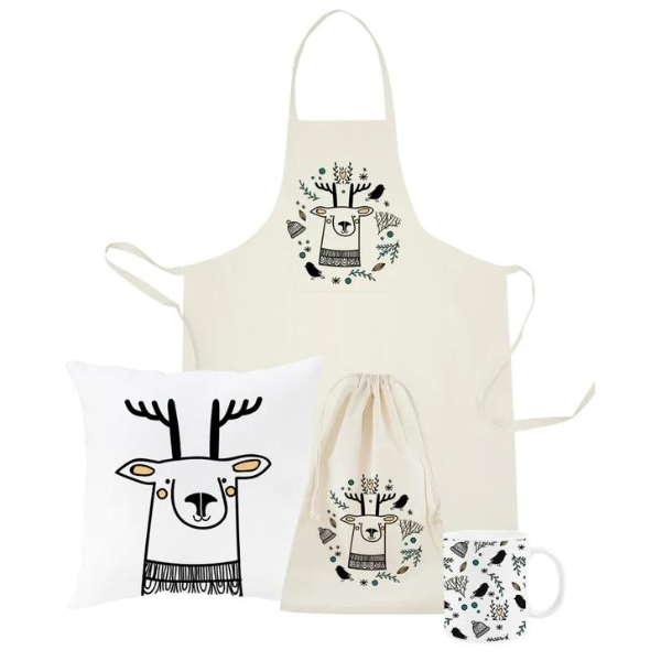 Setul cadou format dintr-un săculeț, o cană, o față de pernă și un șorț reprezintă un cadou special pentru sărbătorile de Crăciun. Este un produs atât funcțional, cât și decorativ, ideal pentru a fi oferit celor dragi. Persoana care va primi acest cadou va fi cu siguranță încântată de originalitatea lui.