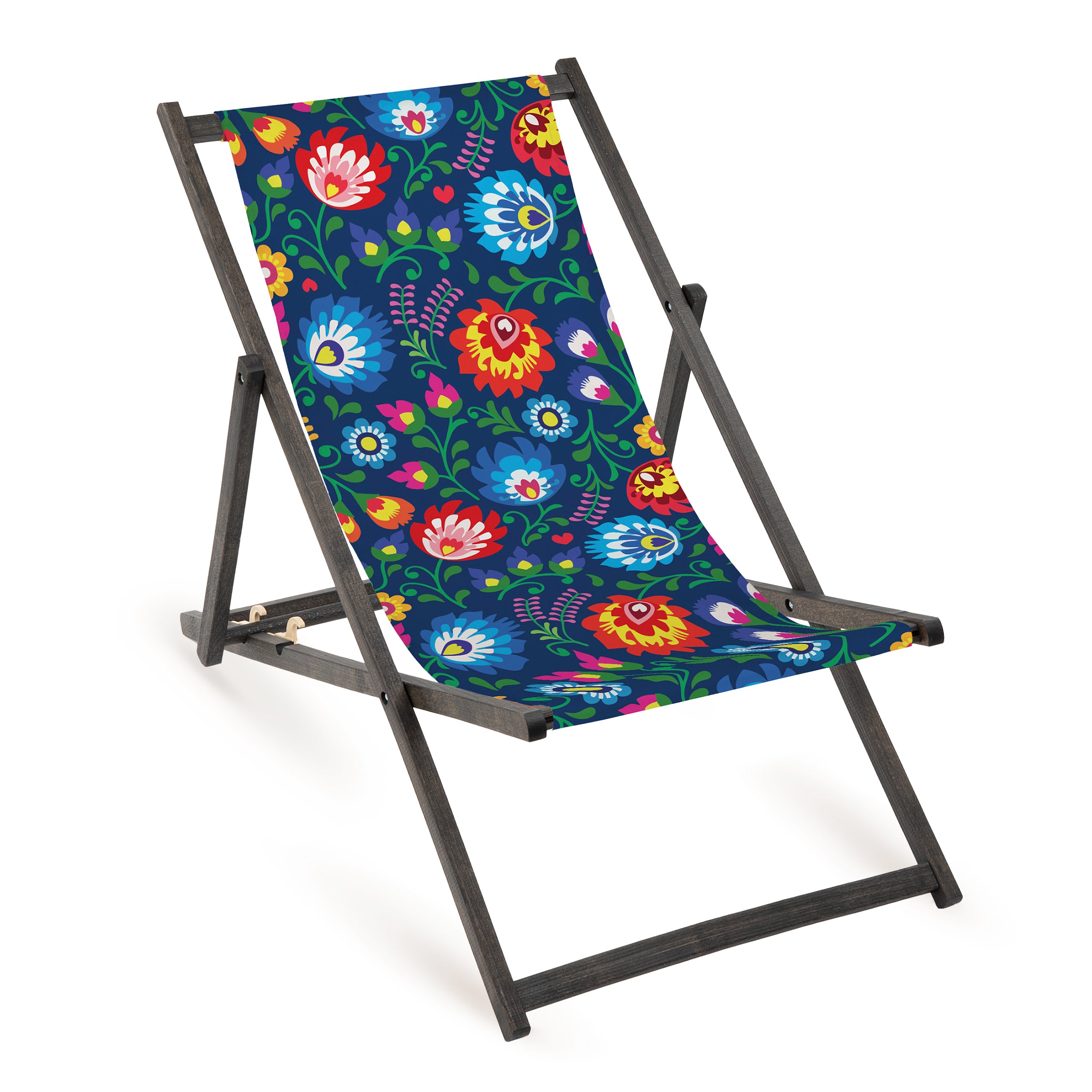 Pariezi pe șezlong de plajă din lemn cu imprimeu FOLK BLUE și creează-ți propria zonă de relaxare, confortabilă, elegantă și pregătită pentru orice soare de vară.