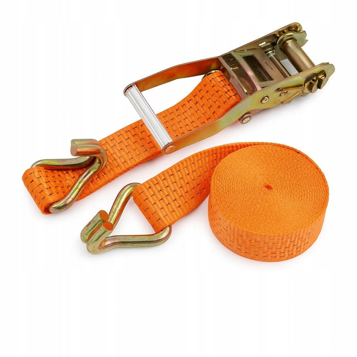 Wytrzymała taśma poliestrowa, odporna na UV i ścieranie, gwarantuje pewne mocowanie ładunku na lawetach i przyczepach. Zabezpiecz ładunek profesjonalnie i jedź bez stresu!
