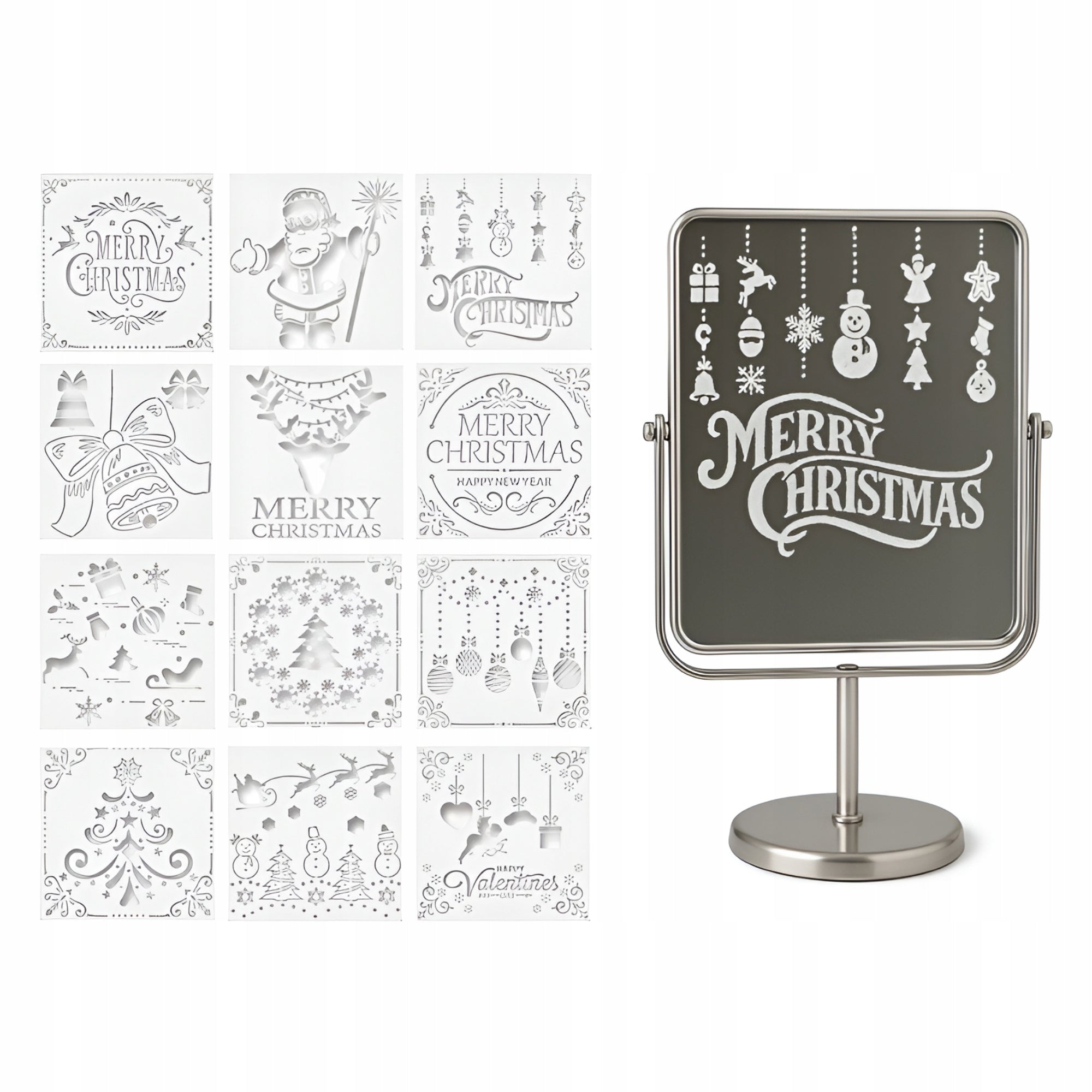 Wybierz świąteczne szablony do sztucznego śniegu na okno. Zestaw 12 wzorów z motywem Merry Christmas do szybkiego tworzenia dekoracji bożonarodzeniowych na szyby, lustra i witryny. Postaw na szablony PET wielokrotnego i wyczaruj świąteczny klimat w kilka minut!