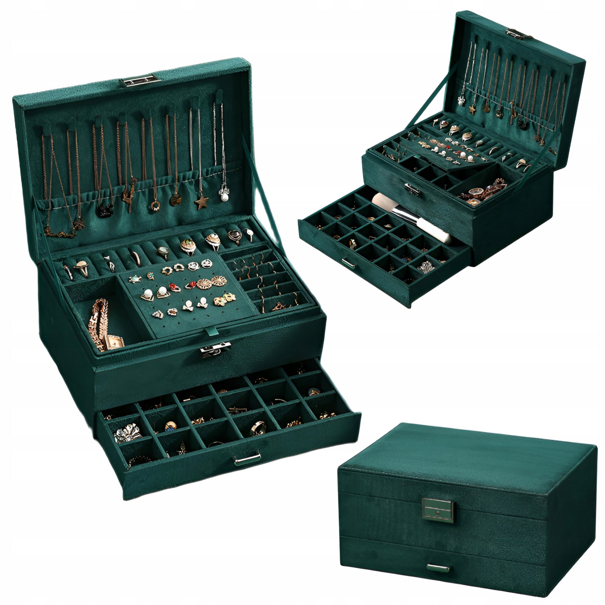 - Porządek bez wysiłku: Dedykowane strefy na pierścionki, kolczyki, łańcuszki i zegarki zapobiegają plątaniu i zarysowaniom