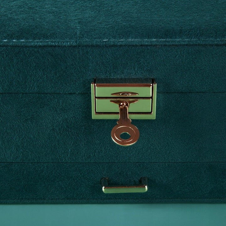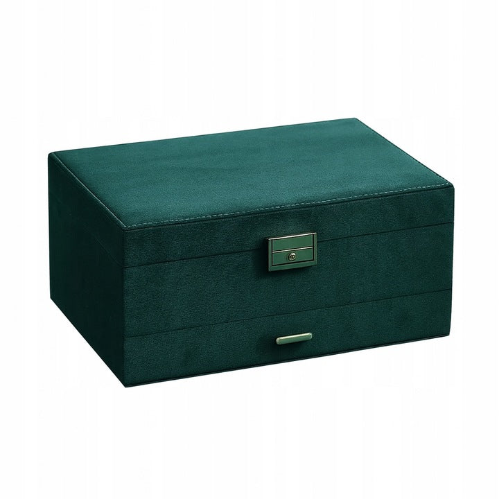 Szkatułka na biżuterię kolorze butelkowej zieleni ze złotymi detalami. Uporządkuj pierścionki, kolczyki, łańcuszki i zegarki w jednym pudełku i chroń je miękką wyściółką. Postaw na elegancję i funkcjonalność na toaletce !